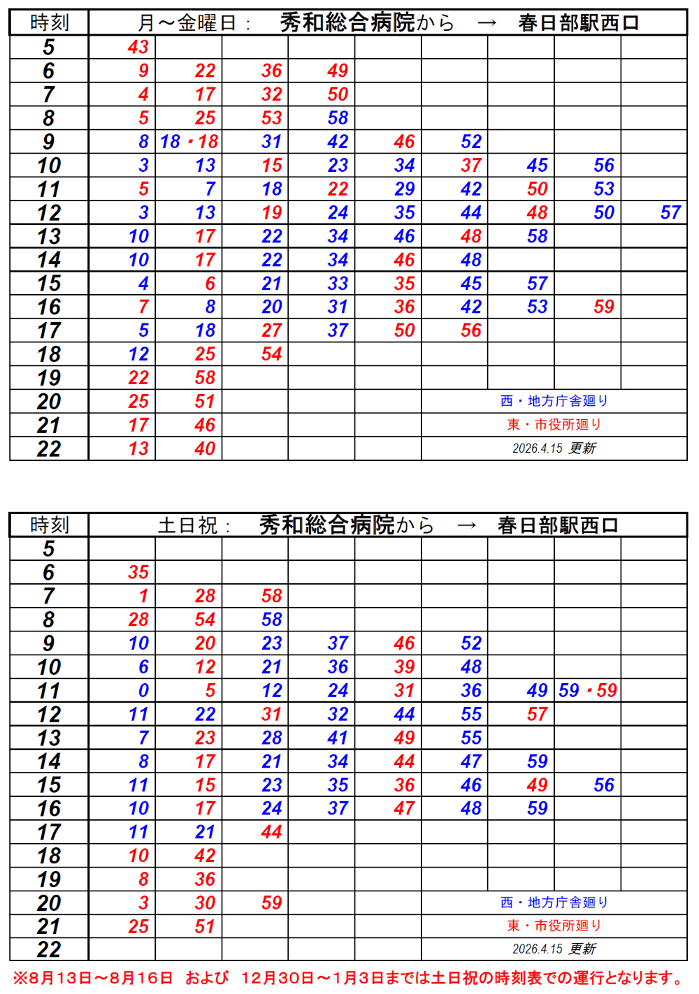 春日部西口-秀和総合病院間のバス時刻表は次のとおりです。