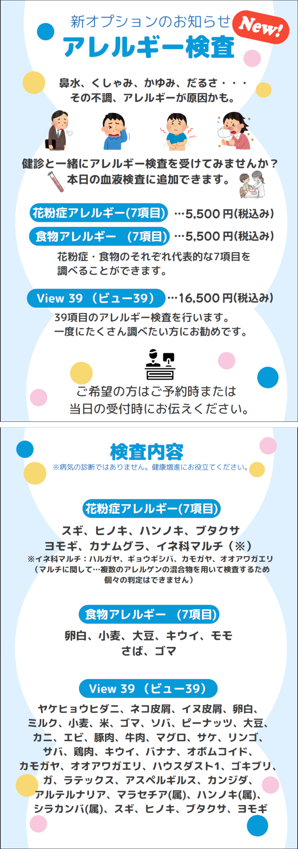 > 病院からのお知らせ > 健診センター:2月からオプション検査にアレルギー検査が加わります