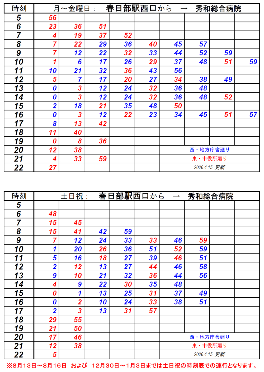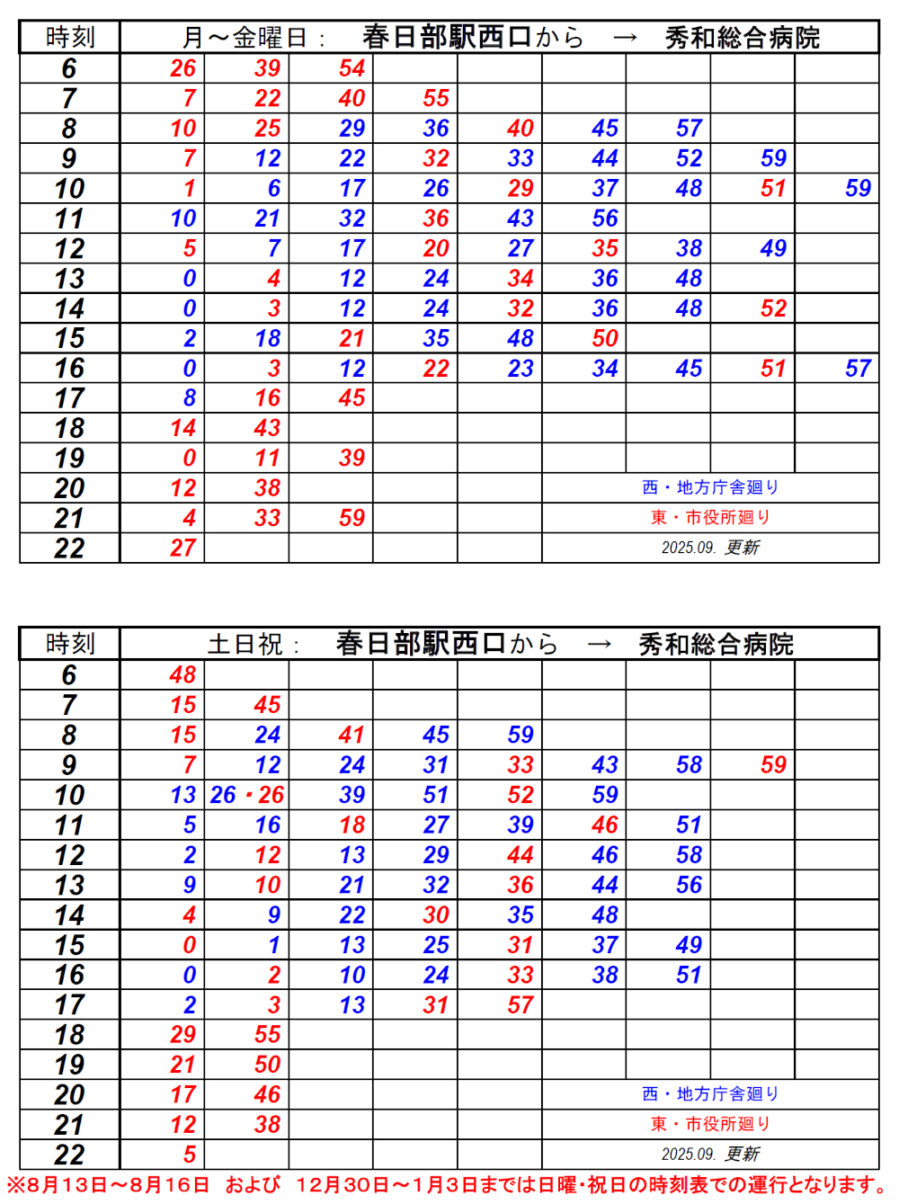 春日部西口-秀和総合病院間のバス時刻表は次のとおりです。
